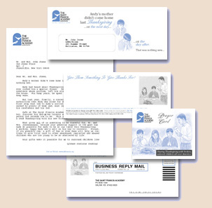 The Saint Francis Academy has been the voice of hope for children, youth, and families in crisis since 1945. This ministry has earned a commendable reputation for helping restore wholeness to lives shattered by abuse, neglect, chemical dependencies, gang affiliations, and conduct disorders. This package was part of the Thanksgiving donor acquisition campaign.